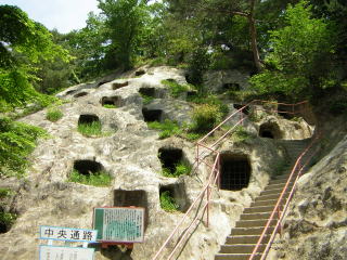 観覧券(200円)を買って中へ入ると、岩の斜面に多くの横穴があいています。この穴は古墳時代の墓穴だそうです。