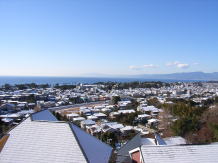 高度が上がり海が見えてきました。民家の屋根は雪で真っ白。高田公園への道標から階段を登り切ると一面真っ白な