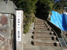 道標を過ぎると、長い木組みの階段。登り切ると水道局の東小磯配水池がありました。少し下り、幅の広い横木の階段を