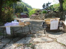 右に「大釜弁財天道」の石柱。その先の民家の前に置かれた、「梅干し100円、さといも200円」。さといも1袋を買いました。