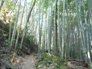 すぐに山道になりました。杉林、竹林の道を登って行くと、尼将軍供養塔。ここから下りになり、開けてきて、ふだらく霊園に出ました。