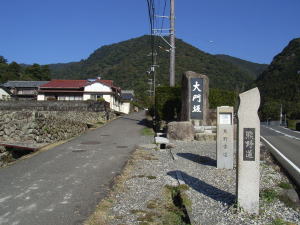 市野々小学校を過ぎると、庚申塔。すぐにお杉社。二ノ瀬橋を渡ると、県道に出ました。大門坂の道標があり、車道を横切ると大門坂入口。