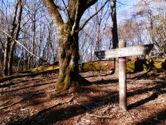 | 2011年12月5日 丹沢山、蛭ヶ岳(神奈川県秦野市、相模原市) たんざわやま、ひるがたけ 丹沢山→不動ノ峰→蛭ヶ岳→姫次→黍殻(きびがら)山→焼山→焼山登山口→三ヶ木バス停 4時45分に起床。夜中に強風が吹き荒れていましたが、だいぶ収まってきたようです。 1階の土間でお湯を沸かしてコーヒーを入れます。ちょっと外に出てみると、凄く寒いですが、星空が広がっています。 発電機が動き出し、明かりが灯りました。6時に朝食です。おかずは質素ですが、お混ぜご飯。美味しく頂きました。 荷物を整理して出発準備OK。2階の窓から日の出を待ちます。6時32分に陽が昇りました。 まずは富士山を眺めて、6時55分に小屋を出発。今日は初めてのルート、蛭ヶ岳の標識に従って行きます。 少し下ると、不動ノ峰が見えてきました。階段を下り尾根道を行きます。登山道には霜柱がいっぱいです。 今日も朝から快晴で、筑波山が見えます。少しずつ登って行くと、不動ノ峰 休憩所。そして不動ノ峰です。 西側が開けて、どかーんと 富士山。熊笹の登山道を行くと、蛭ヶ岳が見えてきました。 角のような岩が2つある鬼ヶ岩を過ぎると、クサリのある岩場を、注意しながら下ります。 そして登り返すと、蛭ヶ岳山荘があり、蛭ヶ岳に到着。丹沢最高峰の標識があり、神奈川県の最高峰です。8時25分。 山頂は広くベンチがあり、良い眺めです。西側の すぐそこに見える頂きは、檜洞丸です。先ほど居た丹沢山は、逆光で眩しいです。 ベンチで小休止して、ミカンを食べました。姫次の道標に従い、尾根道を行きます。長い階段を下って行くと、 富士山が見えなくなってしまいました。ブナ林の中を行くようになり、地蔵平、原小屋平を過ぎて、姫次に到着。 ベンチがあり振り返ると、富士山の眺めが素晴らしいです。逆コースで歩いてくると、ここで正面に富士山が見えるんですね。 なお、姫次は東海自然歩道全コース中の最高地点だそうです。 富士山、蛭ヶ岳、檜洞丸とも ここでお別れ。小休止して、丹沢主脈の尾根道を、緩い傾斜で下って行きます。 青根への分岐がありましたが、ここが八丁坂ノ頭でしょうか? 再び青根への分岐を過ぎると、右下に小屋が見えてきました。 尾根道を外れて、小屋に下って行くと、草原が広がっていてベンチが点在しています。小屋は草原を見渡せる所に建っています。 ここは黍殻(きびがら)避難小屋。トイレは別棟にあります。10時30分。日当たりが良く、温かいです。ここで昼食にしました。 乾燥野菜を入れてインスタントラーメンを作りました。 35分ほど休んで出発。尾根道に戻ります。少し行くと、道標はありませんが、左上に向け目印のテープが続いています。 黍殻山への道のようです。登って行きます。踏み跡は、はっきりしませんがテープが続いているので大丈夫でしょう。 10分ほど登ると、無人雨量計が設置されていました。ここが黍殻山の山頂です。山頂標識は、ありませんでした。 下って行きます。こちら側の登山道は、はっきりしていて歩きやすいです。短い痩せ尾根を通過して、尾根道に合流。 ここには、黍殻山への道標がありました。緩い傾斜の尾根道を下って行きます。平丸分岐、鳥屋分岐を通過。 鳥屋方面は通行止めになっていました。そして最後のピークの焼山に到着。石祠が3つ。1つは屋根が落ちていました。 そして、鉄骨製の展望塔が建っています。少し奥に入ってみると、古い石碑と三角点がありました。 ここからは急な下りになり、北側の道になり、薄暗くなりました。紅葉してる所を過ぎて、道標の西野々に向かって下ります。 石畳の道をしばらく行くと、西野々・焼山登山口バス停の分岐。焼山登山口に向かいます。すぐに林道に出ました。 車止めゲートを抜けて、黄葉の林道を行きます。山ノ神を過ぎて、集落が見えてきました。 国道413号に合流して、右に少し行くと、諏訪神社。ここに焼山登山口バス停がありました。13時35分。 三ヶ木行きのバスは平日6本。13時18分のバスが行ったばかり。次は16時23分と3時間以上ありません。 初めから、三ヶ木まで歩く予定でいました。お昼を簡単に済ませば、間に合ったでしょうが、天気が良いので、ゆっくりしました。 神社で荷物を整理、神社の裏に トイレがあるので、顔を洗ってさっぱり。登山靴を脱いで、スニーカーに履き替えました。 14時に三ヶ木を目指して出発。15時15分に三ヶ木バスターミナルに到着しました。 15時29分のバスで相模湖駅へ。相模湖16時21分の電車に乗車。高尾で乗り換えて帰宅。 今日の天気も快晴。今日のコースは、平日だった事もあり、登山者は少なく、気持ちの良い、山歩きが出来ました。 いずれ、逆コースを歩いてみたいですが、登山口までの交通の便が悪いので、どうでしょうか? 2日間共、良い天気に恵まれました。 ※「ヤマレコ」 http://www.yamareco.com/modules/yamareco/detail-154568.html |