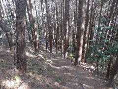 | 穏やかな尾根道 | 飯盛山山頂(501m) | ロープのある、落ち葉の急な下り | ||