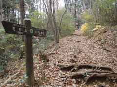 | 2014年11月28日 唐沢山、諏訪岳、晃石山、太平山 (栃木県) からさわやま、すわだけ、てるいしさん、おおひらさん 堀米駅→唐沢山→諏訪岳→京路戸峠→村桧神社→桜峠→晃石山→太平山→新大平下駅 昨年同時期にも出掛けましたが、今年は逆ルートで歩きます。 東武鉄道 とうきょうスカイツリー駅5時47分の区間急行で館林へ。7時15分発の佐野線に乗り換えて7時35分に堀米駅に到着。 東口に出て少し行くと車道に出て左に行きます。歩道橋のある交差点を過ぎて、さらに進みます。前方には山が近づいてきました。 道が左右に分かれて右に行くと、唐澤山神社入口の看板があり、緩い傾斜の登り道になりました。 道は樹林の中に入って行き、だんだんと木々が色づいてきました。道標があり横木の階段から山道に入りました。 「見晴小屋」の標識で岩を登り切ると、テーブルとベンチの置かれた見晴小屋跡。曇っていますが、近くの山並みが見えます。 少し下って登り返し、小さな橋を渡ると岩の上にでます。ここからジグザクの車道と唐沢山が見て、山肌が紅葉しています。 下って行くと鏡岩があり、車道を横切り横木の階段を登り、右の鎖の柵がある岩場を登り切ると、天狗岩の上です。 眺めの良い所ですが今日は遠くが見えません。天狗岩から階段を下って行くと、真っ赤な紅葉、鮮やかです。 鳥居をくぐり、神橋を渡り参道を行きます。紅葉は鮮やかで、葉が参道に垂れ下がっています。 石段を登り、鳥居、神門、社殿。そして奥に本殿です。社殿のある場所は本丸跡。社殿の横の階段から下って行きます。 時刻は9時30分。朝が早かったので昼食をレストハウスで食べるつもりでしたが、まだ開いてませんでした。 事前に営業時間を確認していたのですが? 昼食は諦めて今日は、手持ちの食べ物で、空腹を紛らす事になりました。 レストハウス前の駐車場を抜けて林道に入り、京路戸峠に向かっていきます。山道になりますが、時々林道と交差します。 林道から 「見晴休息所」の道標があり、横木の階段を登って行くと、テーブルとベンチのある休憩所。見晴はありません。 メロンパンとコーヒーで小休止。下って行くと林道に合流。「関東ふれあいの道」の石柱があり、尾根道を行きます。 下って行くとテーブルとベンチのある鞍部。京路戸峠です。左に下ると多田駅方面ですが、さらに尾根道を直進します。 少し行くと、諏訪岳・村桧神社分岐。まずは左の諏訪岳に向かいます。北西側に山並みが見えます。 そして急斜面を登り切ると、諏訪岳に到着しました。休んでいると青空が見えてきました。 10分ほどして下山します。村桧神社方面に下ると思われる登山道があり、行けそうな感じでしたが分からないので、 来た道を戻り、諏訪岳・村桧神社分岐から村桧神社に下って行きます。 登山道に陽が射し込み、紅葉が映えます。やっぱり青空が良いですね。唐澤山から歩いてきた山並みが見えて、 前方には、下ってから歩く辺りも見えています。道標があり左から道が合流。手書きの道標が取り付けてあり、 やはり諏訪岳から直接ここに来れるのでした。次回はこの道を使いましょう。 テーブルとベンチのある小広場を過ぎて、村桧神社の境内に入りました。 階段を下りると、村桧神社と大慈寺との間に真っ赤に紅葉した木。ここからしばらくは舗装道路を歩きます。 歩き始めてすぐにラーメン屋さんがありました。飲食店など無いと思っていたで、びっくり。早速入り昼食にしました。 お腹が満たされて、桜峠に向かいますが青空が無くなり、また曇ってしまいました。 要所に道標があり迷う事はありません。東北自動車道の下をくぐります。畑の中の道を行きます。 登り坂になりました。この辺りはゴルフ場があります。 ショートカット道を登り、ゴルフ場を繋ぐ橋の下をくぐると下りになり、集落に入って行きます。 川に沿った道を行くと桜峠への道標があり、舗装道路から林道に入りました。錦鯉放養池に沿って行き、森に入りました。 「桜峠 0.3km」から山道になり横木の階段を登り切ると、東屋の建つ桜峠です。ここから唐澤山〜諏訪岳の山並みが見えます。 手摺のある急な登りから少しで、青入山。歩きやすい尾根道を行きます。 道標があり晃石山は右を指していますが、こちらは晃石神社経由の道。直進して登ると、小さな祠のある晃石山。 遠望は利きませんが、山並みが見えて良い眺めです。山頂の鳥居をくぐり下ると 晃石神社。 テーブルとベンチがあるので、小休止。お団子 と みかんを食べました。小さな登り下りがあります。 すると登山道に沿って整地されています。林道が出来るのでしょうか? ぐみの木峠を過ぎて林道を横切ります。 道標の「富士浅間神社」に登って行くと富士浅間神社。太平山山頂は、神社の裏にあります。 露岩を下り奥宮を過ぎて、太平山神社境内に降りました。階段を下り隋神門をくぐり車道に出ました。 少し右に行くと、土産物屋が並ぶ謙信平。真っ
