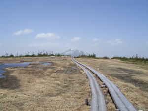 田代原を抜けると、アヤメ平の稜線が見えてきました。残雪が少しずつ現れてきて、アヤメ平直下を過ぎると、水場。冷たい水で顔を洗います。
