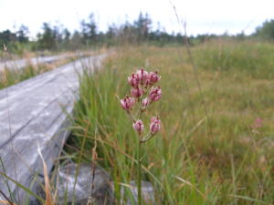 正面に景鶴山、木道脇には、ウメバチソウ、エゾリンドウ、オゼミズギク、ミヤマアキノキリンソウ、ワレモコウ、サラシナショウマ、チョウジギクなどが見られます。