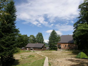 小屋前に咲いているヤナギランはもう終わりです。休んでいる間に、雲が取れてきて青空に代わってきました。8時05分に出発。