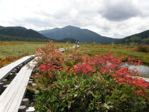 横田代に出ると、木道が一部交換されていました。草紅葉が始まっています。イワショウブが赤くなりキンコウカが茶色くなっていました。